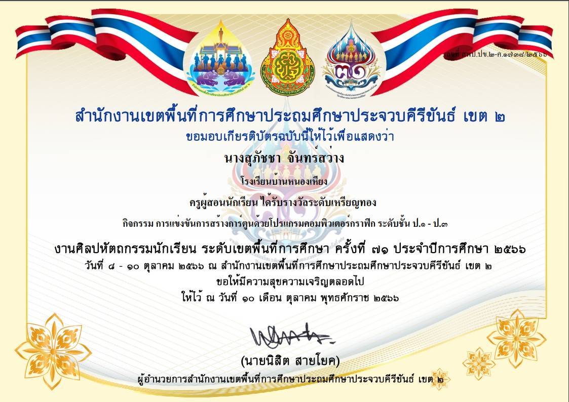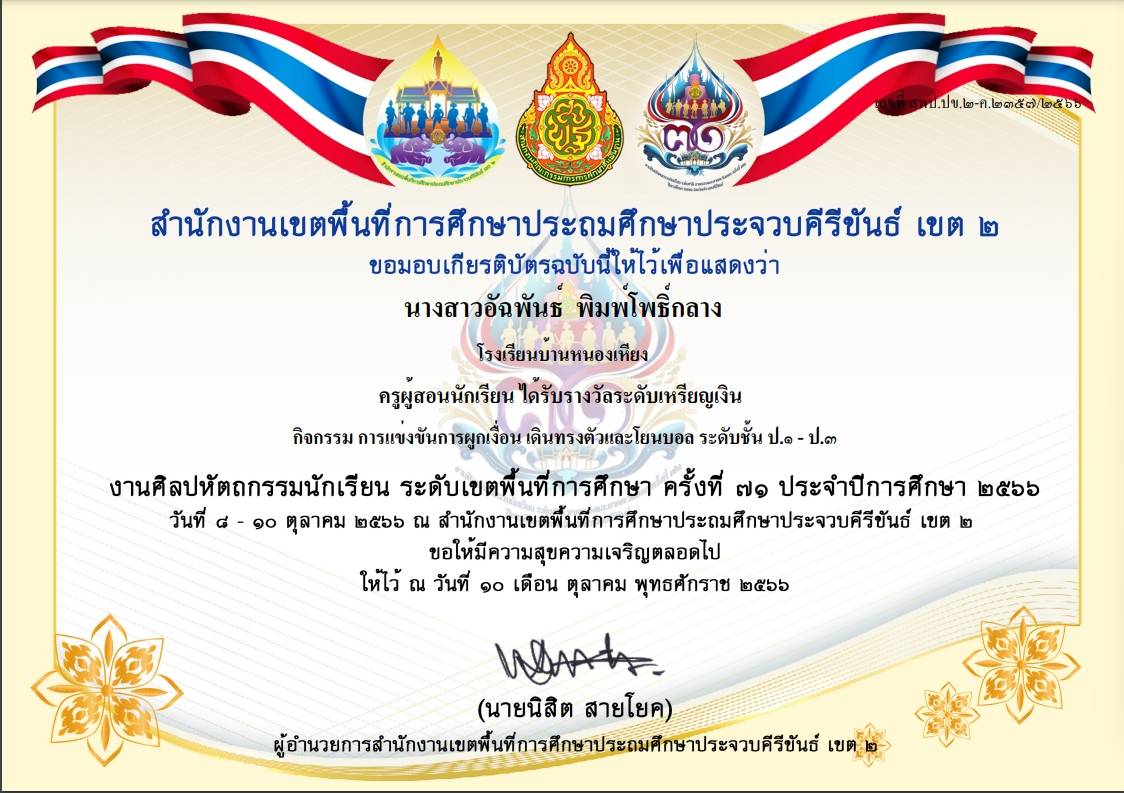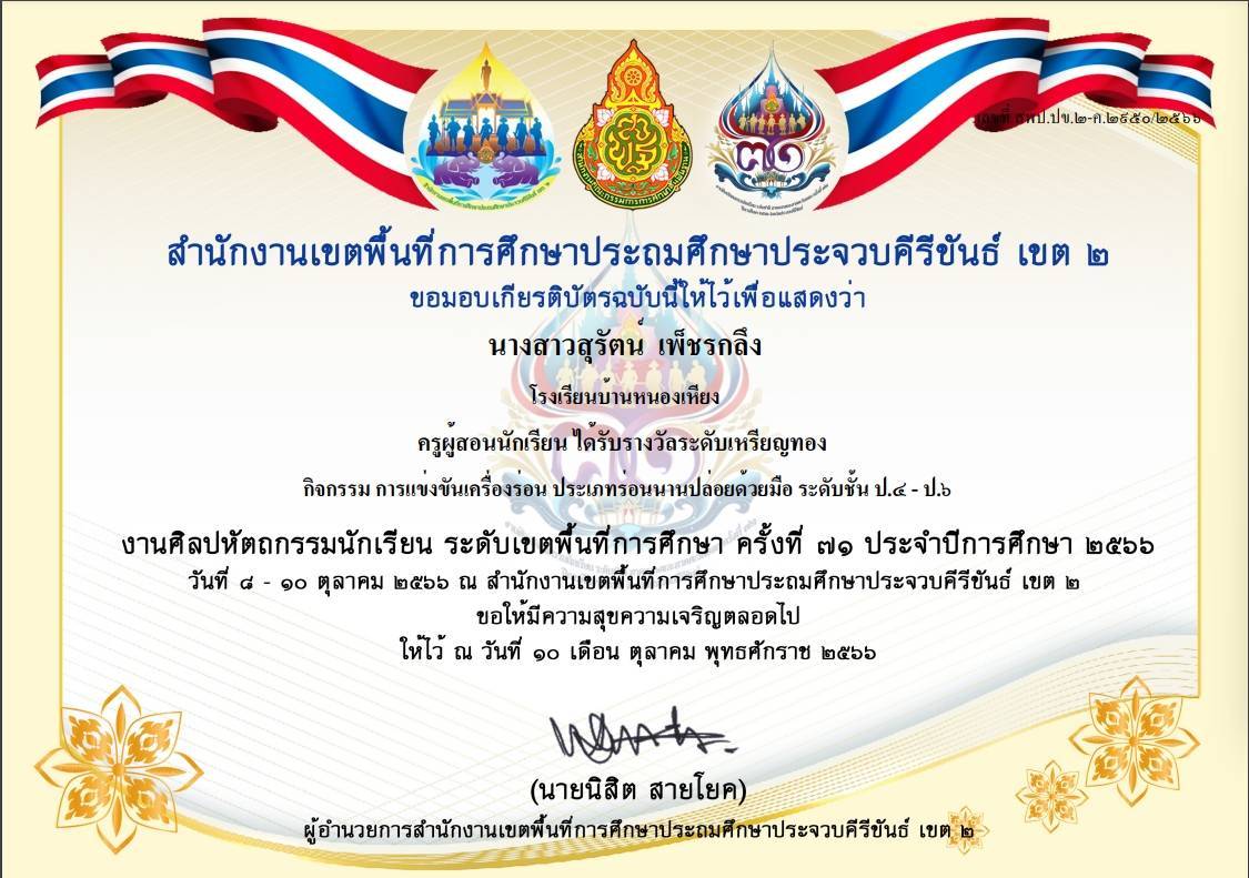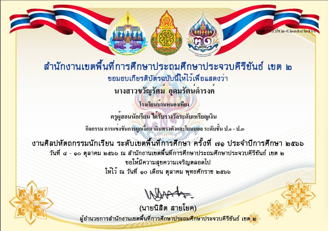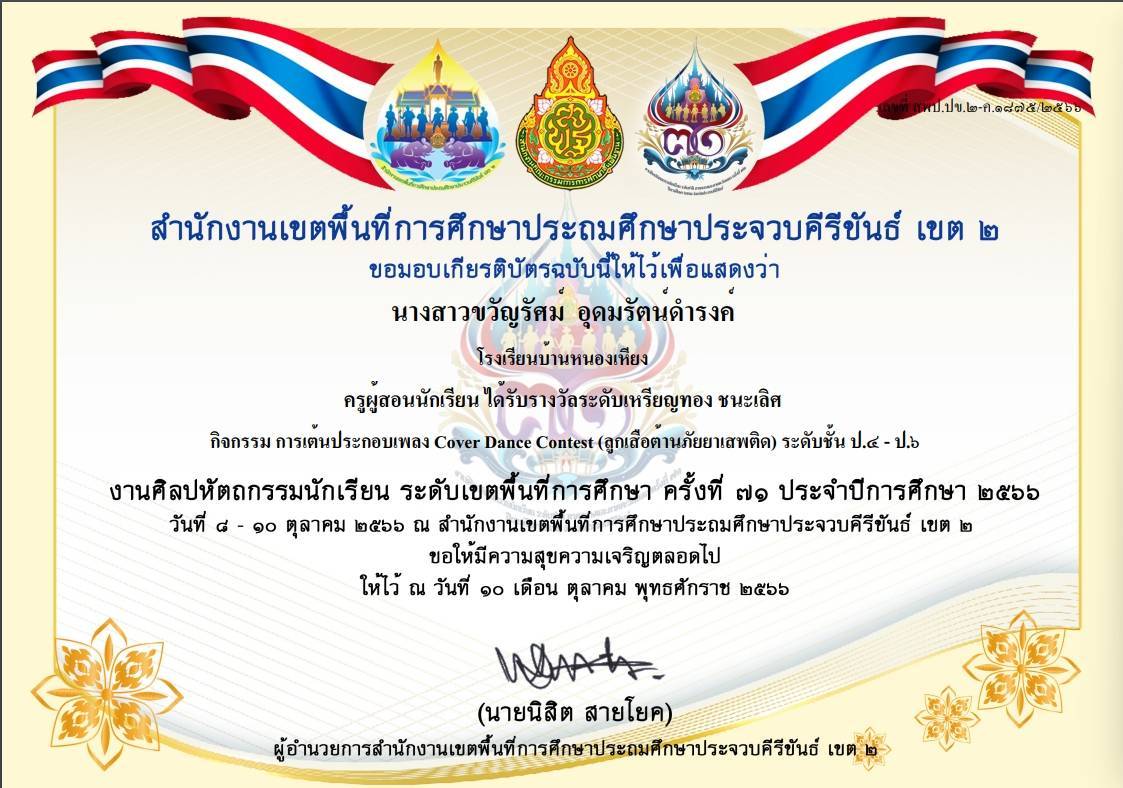 ครูผู้สอนนักเรียน ได้รับรางวัลระดับเหรียญทอง ชนะเลิศ กิจกรรม การเต้นประกอบเพลง Cover Dance Contest (ลูกเสือต้านภัยยาเสพติด) ระดับชั้น ป.4 - ป.6 |