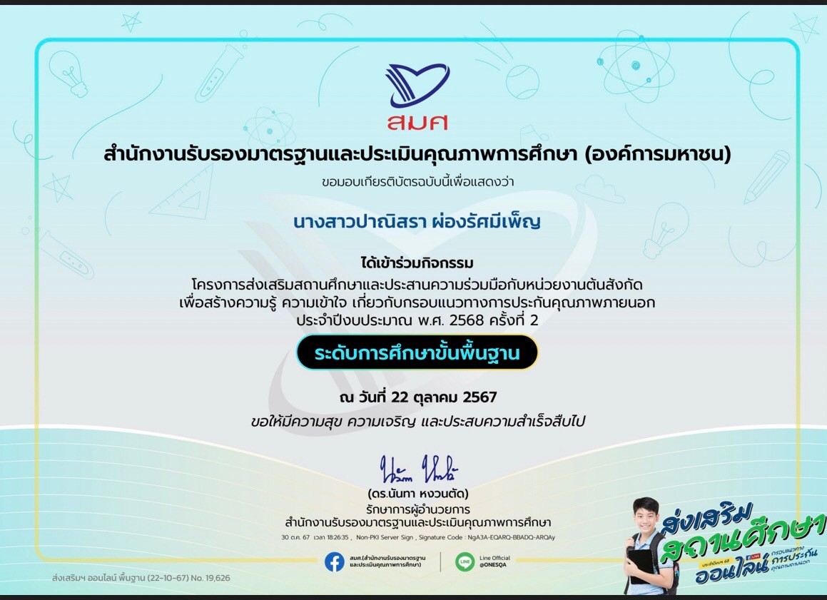โครงการส่งเสริมสถานศึกษาและประสานความร่วมมือกับหน่วยงานต้นสังกัด เพื่อสร้างความรู้ ความเข้าใจ เกี่ยวกับกรอบแนวทางการประกันคุณภาพภายนอก ประจำปีงบประมาณ พ.ศ. 2568 ครั้งที่ 2 |